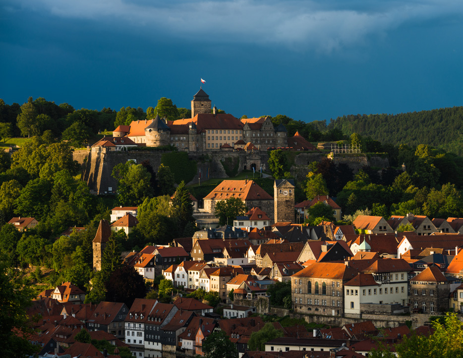 Seinen Waldreichtum trägt der Naturpark Frankenwald als „grüne Krone“ in Bayerns Norden bereits im Namen, doch landschaftlich prägen ihn ebenso seine artenreiche Wiesentäler und seine gerodeten Hochflächen. Zudem ist er Teil eines Schiefergebirges, was sich auch in der Gestaltung seines Häuser zeigt: Noch heute wird der Schiefer als „blaues Gold“ zur Dacheindeckung verwendet. Gekrönt wird der Naturpark von prachtvollen Bauten wie der Festung Rosenburg über Kronach oder der Mantelburg bei Lauenstein.